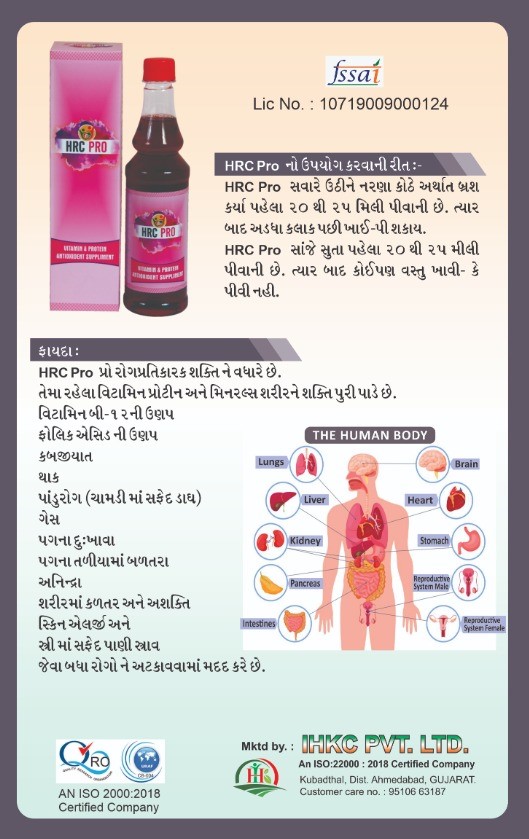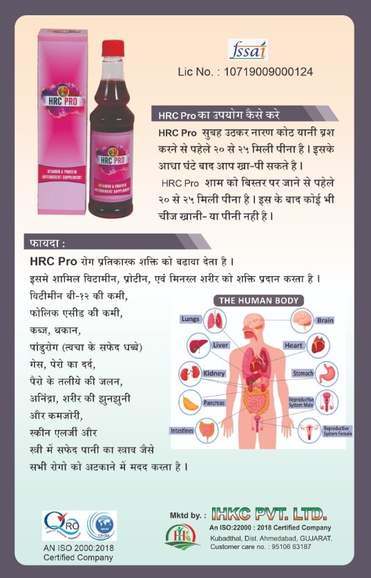 HRC PRO is useful for Deficiency of Vitamin B12, Deficiency of Folic Acid, Constipation, Fatigue, Vitiligo, Intestinal Gas, Leg Pain, Burning Soles Feet, Insomnia, Body Pain and Weakness, Skin Allergy, White Discharge.