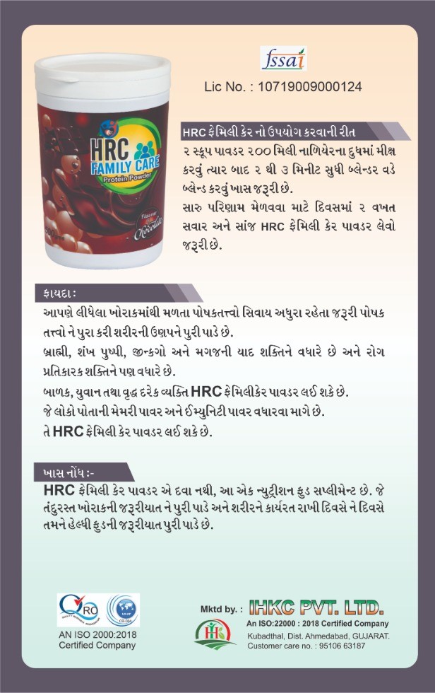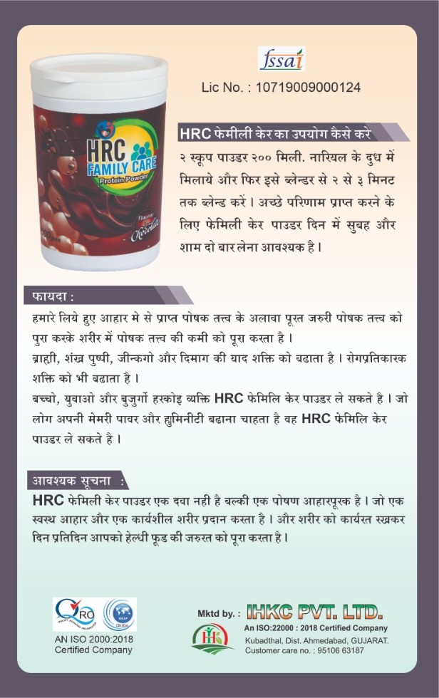 HRC Family care powder is not a medicine. This is a nutritional food supplement which caters to the need for healthy food and keeps the body functioning.