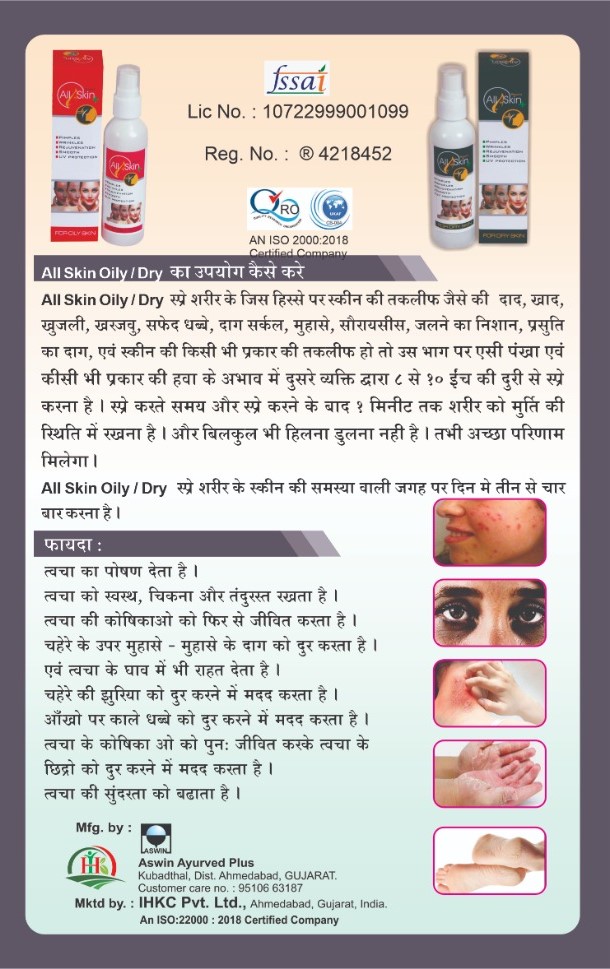 Introduction :All Skin Dry Spray is made up of the best sources of Aloe Vera, Glycerin, Strawberry Extract, Raspberry Extract, Vitamin E, Potassium Sorbate, Rock Salt and Pure Water.